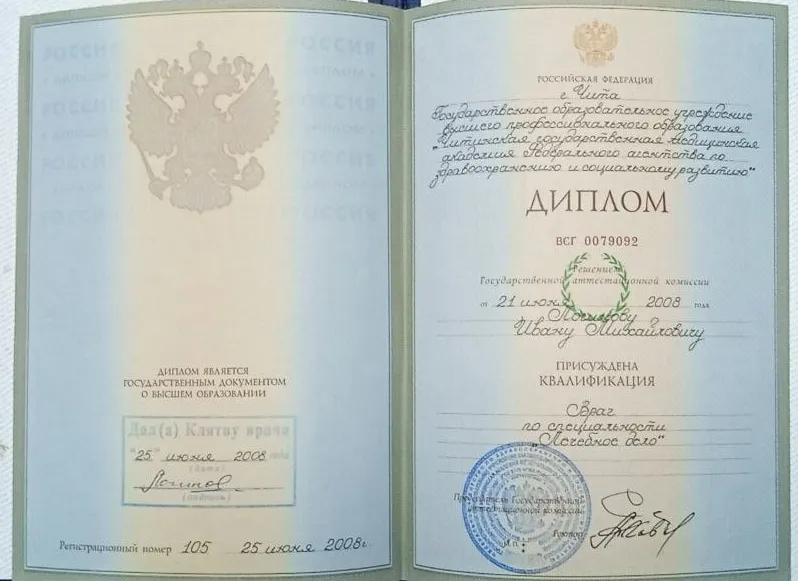 - 2008 — ФГБОУ ВО "Читинская государственная медицинская академия" (Лечебное дело);