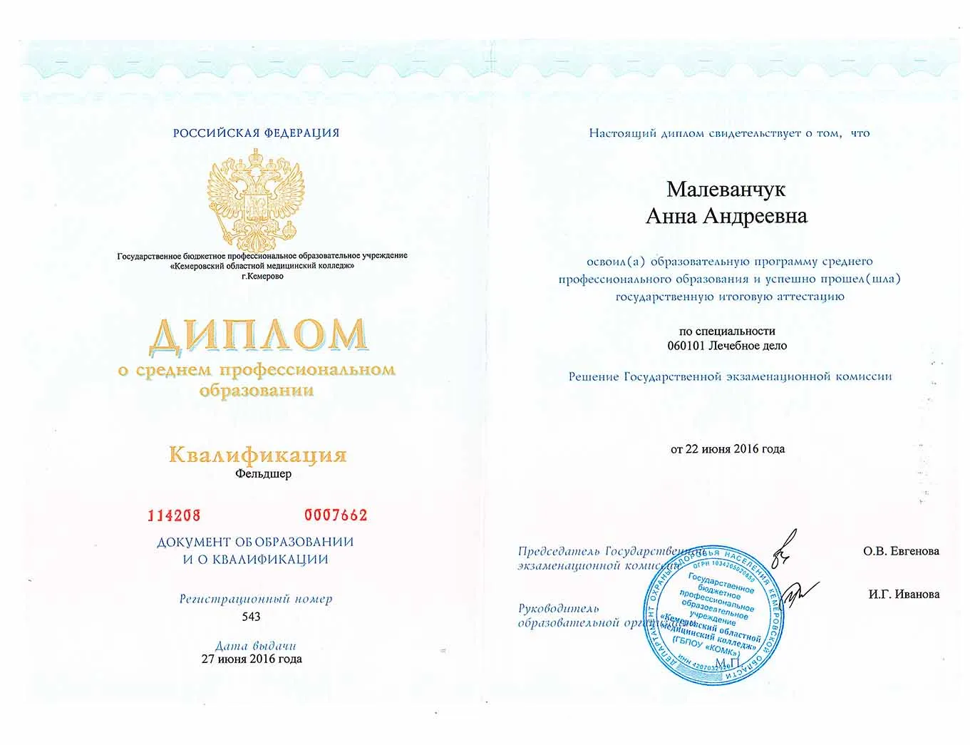 • 2016 - ГБПОУ "Кемеровский областной медицинский колледж" ( Диплом о среднем профессиональном образовании. Квалификация: фельдшер)